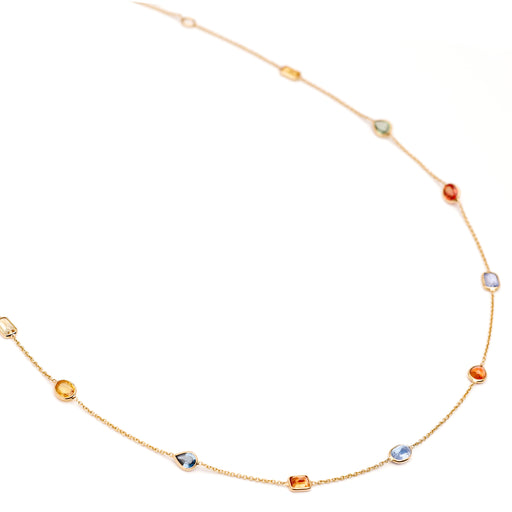 View full detailsBlue, green, yellow, pink, and orange sapphires of different shapes come together to create this beautiful and very wearable necklace. Multi-colour...