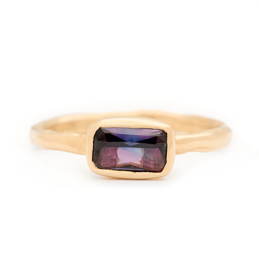 View full detailsPurple sapphire with flashes of blue from Australia set in a one-of-a-kind ring mount hand-carved by Johanna. Size 7 | One-of-a-Kind Radiant cut sa...