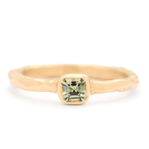 View full detailsGreen square cut Montana sapphire bezel set in a one-of-a-kind ring mount hand-carved by Johanna. Size 7 | One-of-a-Kind14k Fairmined yellow goldTh...
